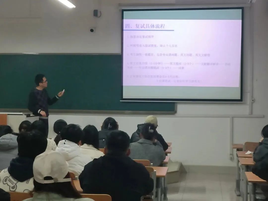 此次讲座的开展,有利于学生进一步了解复试流程,同时对于复试中容易忽视细节,学生有了深刻认识,为同学们准备复试计划提供了帮助,鼓励同学们在接下来的准备中保持积极主动的精神状态奋发向上,在复试中取得好成绩,一战成硕。