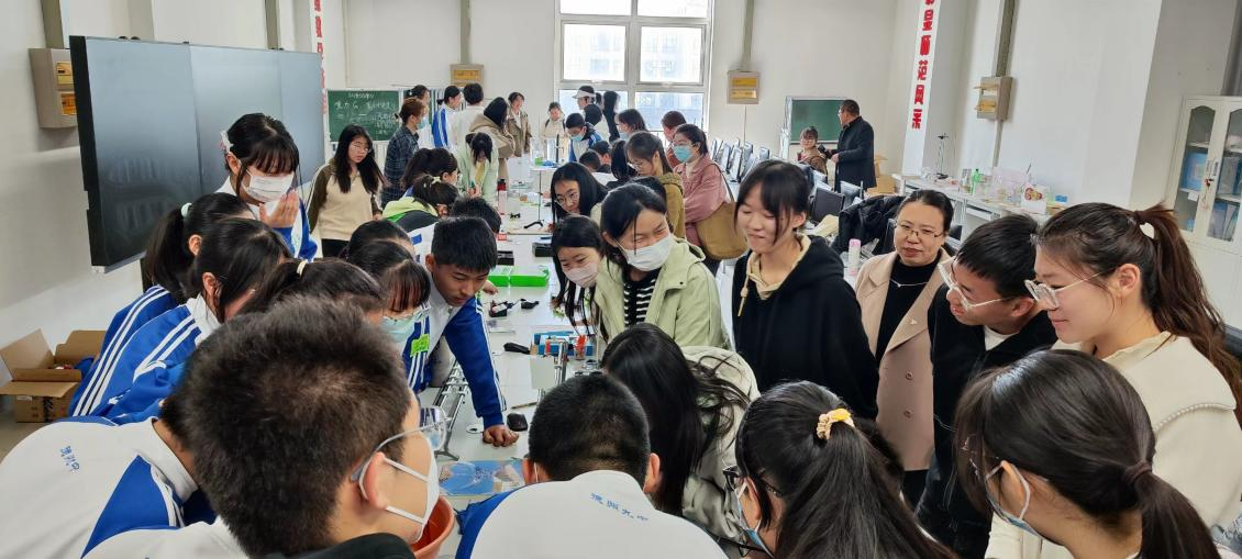 本次来参观的中学生共30余人,对于这次参观他们显得无比兴奋,对看到的仪器设备充满好奇。在近代物理实验室、光学实验室、大学物理实验室,同学们都驻足观看,聆听实验室负责老师的讲解,特别是对空气热机表现出很高的兴趣。在中学物理教法实验室,物理学专业的师范生作为志愿者,为九中的同学们展示了自己制作的多种物理仪器设备,同学们也跟随志愿者的讲解参与到实验中,围着志愿者提问自己感兴趣的问题,现场气氛融洽热烈。之后,九中的同学们还参观了学院电子设计、创新竞赛等实验室,观看自制的优秀竞赛作品。这些来访的中学生们每个人脸上都挂着收获知识的喜悦。