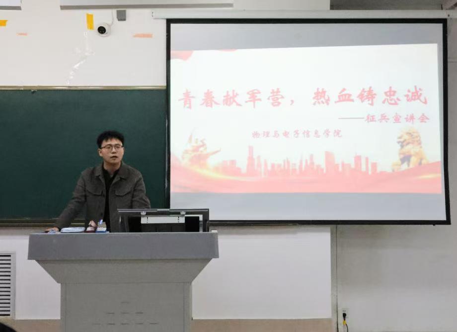 此次宣讲中,物电学院团委书记贾延琨老师详细介绍了大学生入伍的征集条件、应征入伍报名流程、优惠政策以及发展路径,同时还解读了国家对于大学生入伍在学业支持方面的政策,如保留学籍、学费补偿代偿等,强调了征兵入伍对于国家的重要意义。贾延琨老师还结合自己多年的工作经验和身边的真实案例,生动形象地讲述了参军入伍对个人成长和未来发展的积极影响。他鼓励同学们积极响应国家号召,将个人的理想追求融入到国家和民族的事业中去,用实际行动诠释青春的价值与意义。