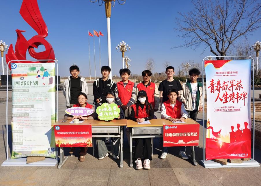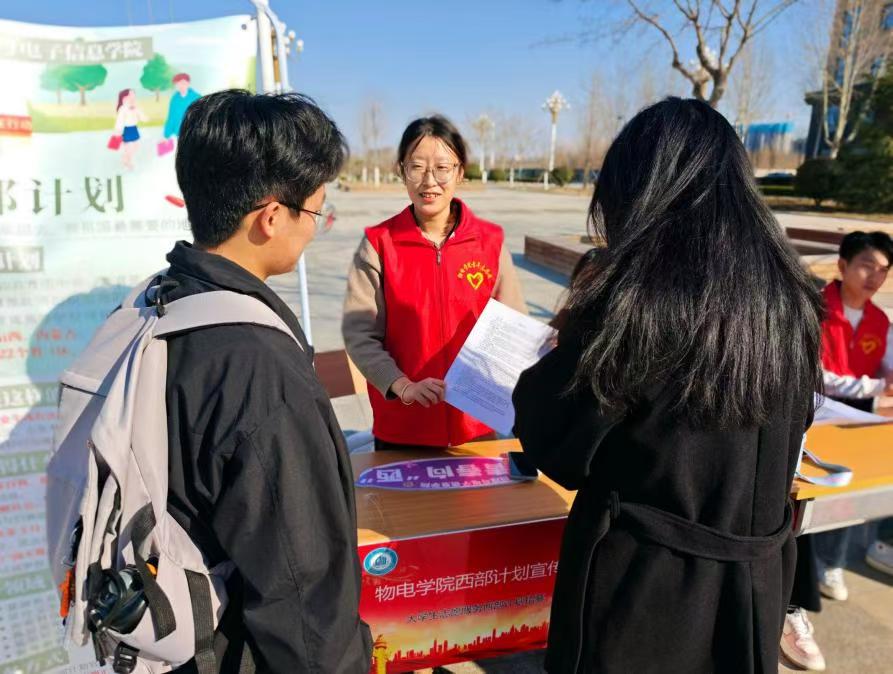 为做好西部计划志愿者招募工作,引导广大青年学生用实际行动践行“到西部去,到基层去,到祖国最需要的地方去”的号召,3月19日下午,物电学院在腾飞广场举办“以青春之名,奔赴西部之约”西部计划流动宣传驿站活动。