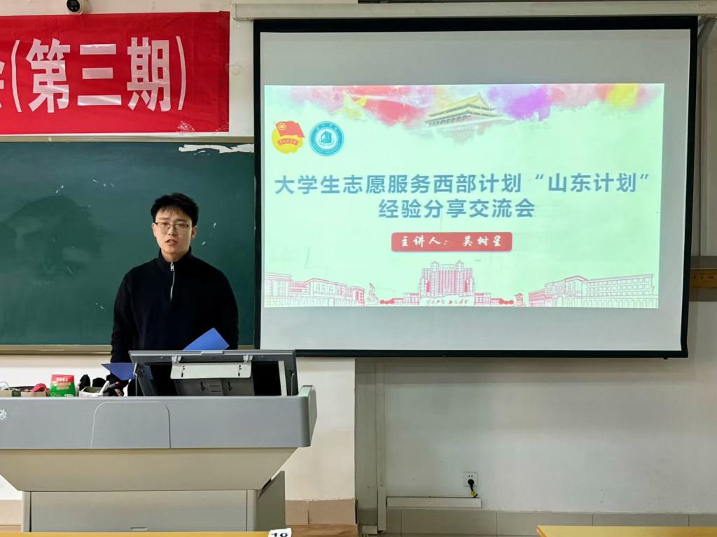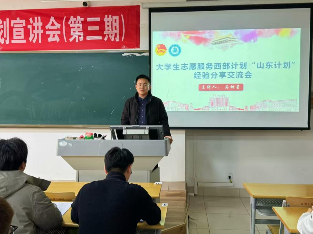 宣讲会伊始,物电学院团委书记贾延琨老师简要介绍了大学生志愿服务西部计划的政策背景、招募流程及保障机制,并鼓励学生结合专业特长投身基层服务。本次宣讲会特别聚焦山东省大学生志愿服务乡村振兴计划,特邀山东省大学生志愿服务乡村振兴计划优秀志愿者、美术学院吴树星老师进行专项经验分享。作为该计划参与者,吴树星老师系统阐释了山东省大学生志愿服务乡村振兴计划的政策背景、战略意义、服务领域及报名通道,重点解析了基层服务岗位设置与专业适配性,帮助物电学子精准把握"专业+乡村振兴"的实践路径。宣讲会最后,秘书处于瑞娇同学精心策划并带领完成“风车时光邮筒:寄给未来的自己”,同学们在信笺上写下对未来自己的寄语或服务承诺。