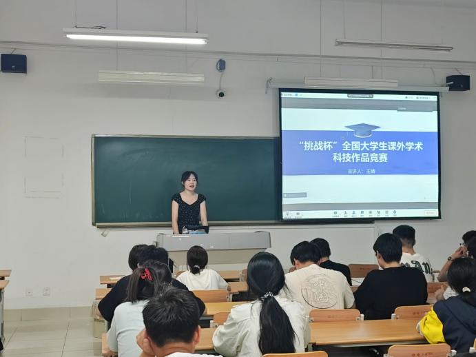 分享会现场,挑战杯省级一等奖获得者、24级物理专业王婧作为主讲人,展开深度分享。王婧首先对挑战杯赛事进行了深度解读。她介绍道,挑战杯由共青团中央等多部门联合主办,是一项规格高、影响力广的重要赛事。赛事不仅设有国际通道,主题分类明确,还具备完善的奖励机制,是培育青年创新人才的重要平台,为同学们提供了展现自我、突破创新的广阔舞台。随后,王婧结合自身参赛历程,通过展示团队研讨、赛事答辩的真实场景,让同学们直观感受到竞赛中的协作氛围与科研探索的严谨态度。此外,王婧还分享了外校优秀项目案例,拓宽了同学们的视野,展现出学科竞赛多元创新的生态。