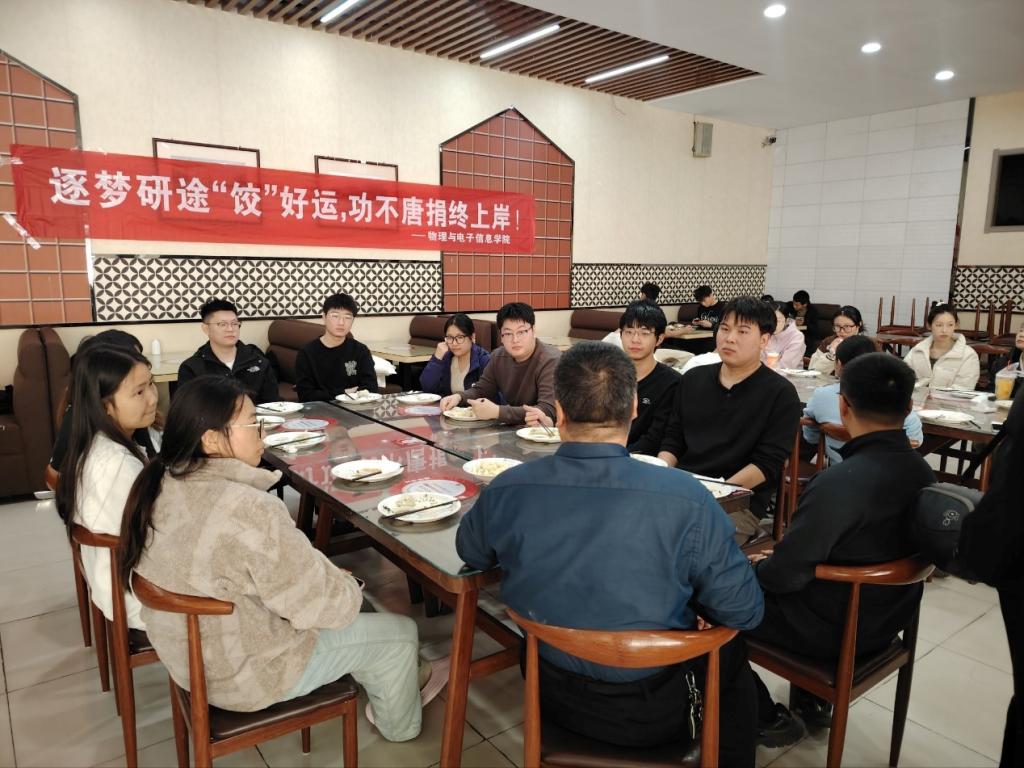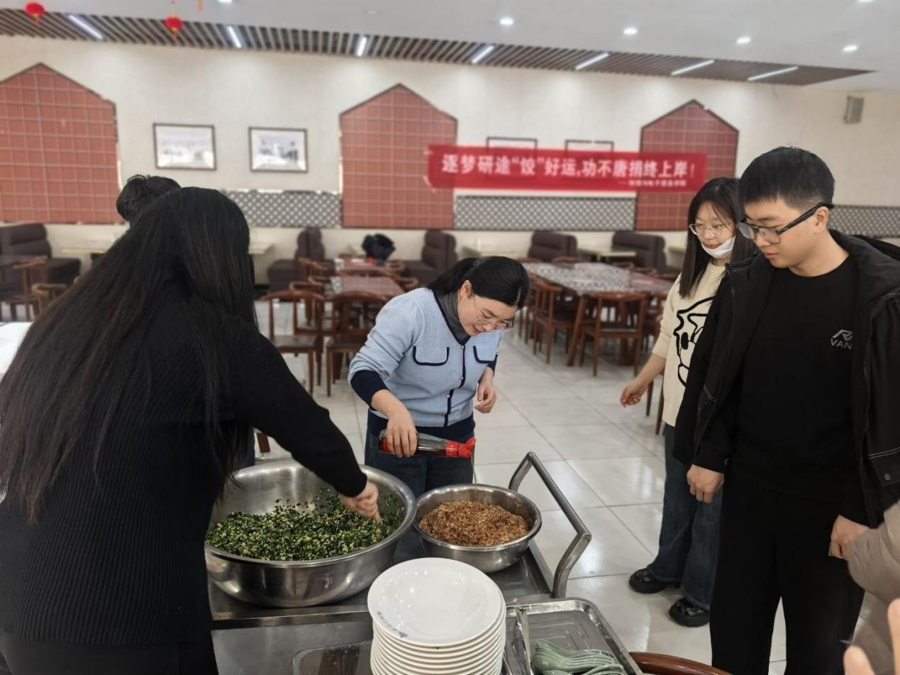 为缓解考研备考压力、传递学院关怀,增强考研学子的归属感与自信心,物电学院于11月15日在教职工餐厅举办“逐梦研途‘饺’好运,功不唐捐终上岸”考研送温暖活动。学院党委书记申青林、副书记刘秀华、辅导员、教师代表及部分考研学子参与此次活动。