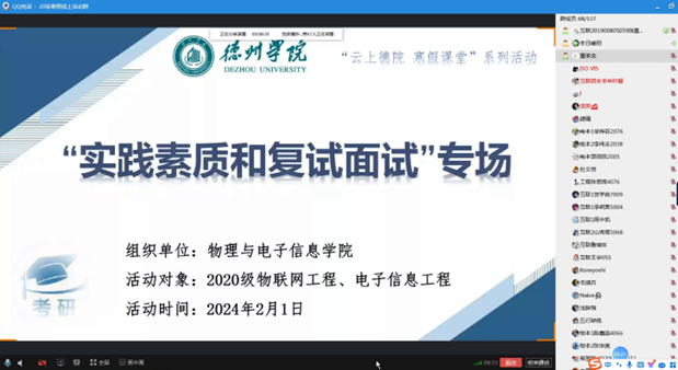 近日,365上市公司举办的“实践素质和复试面试”专场活动圆满结束。本次活动面向2020级物联网工程专业、电子信息工程专业学生,2024年2月1日下午采用线上方式进行,近70名学生参与。