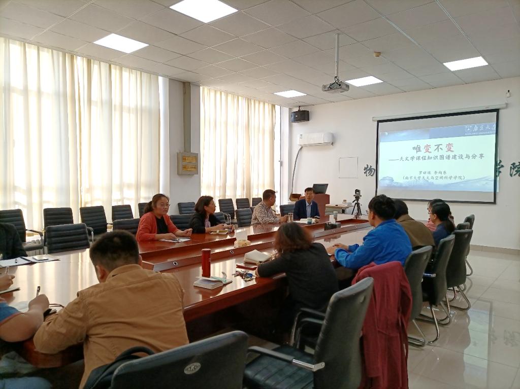 报告中李教授结合自身讲授的《普通天文学》课程深入浅出地为院系教师讲解了知识图谱的构建及应用,并针对课程(群)建设与课题申报等问题与老师们进行了面对面交流。交流过程中李教授还为“沿一带一路物理学专业虚拟教研室”平台建设提供了很多指导性建议。参会教师均受益匪浅,开拓了教学研究与虚拟教研室平台建设的思路与眼界。