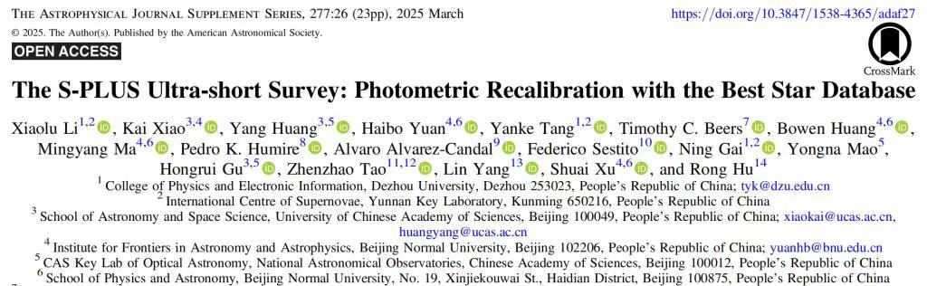 近日,由我校唐延柯教授作为指导教师,2022级物理学(师范类)专业本科生李晓璐同学作为第一作者在SCI一区top期刊《The Astrophysical Journal Supplement Series》(中科院一区,IF=8.6)上发表题为《The S-PLUS Ultra-Short Survey: Photometric Re-calibration with the BEst STar Database》(Li et al. 2025, ApJs, 277, 26)的科研论文。英国正版365首页为成果第一完成单位。