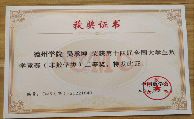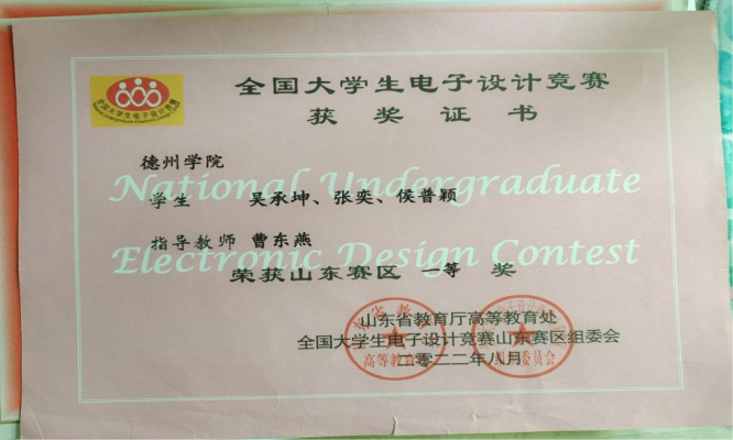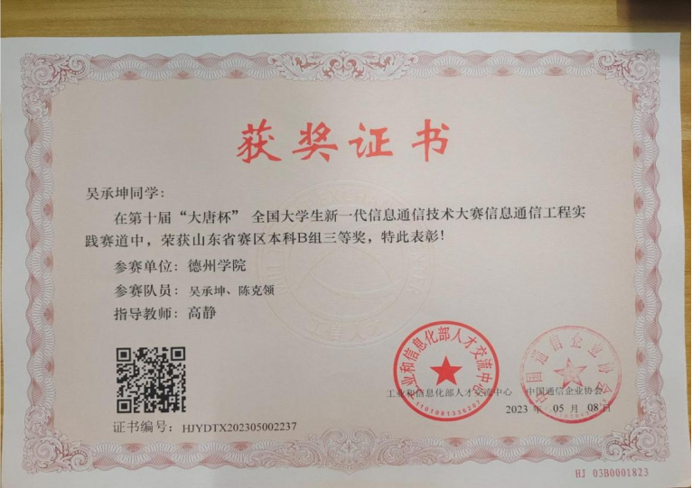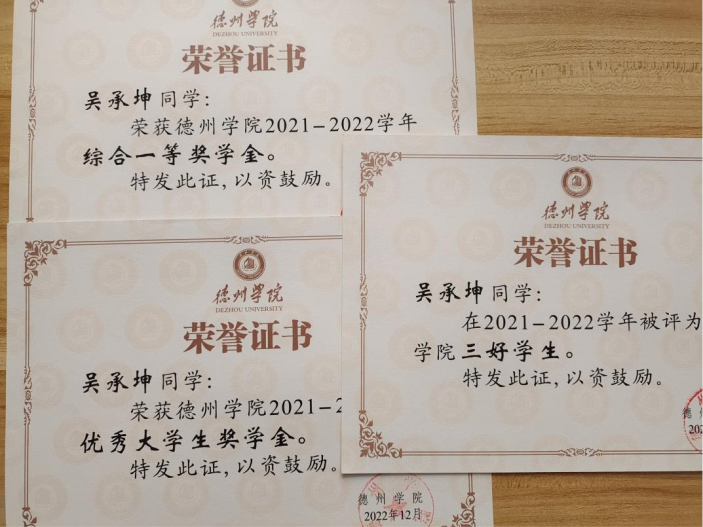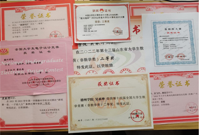 吴承坤,共青团员,365上市公司物联网工程(移动互联)专业学生。2021-2022、2022-2023学年连续两学年学业成绩和综合成绩均位于专业第一名,2021-2022学年荣获英国正版365首页综合一等奖学金、优秀大学生奖学金、三好学生,2022-2023年荣获英国正版365首页综合一等奖学金、优秀大学生奖学金。获全国大学生数学竞赛二等奖,全国大学生电子设计竞赛山东赛区一等奖,大唐杯全国大学生新一代信息通信技术大赛省赛三等奖,蓝桥杯全国软件和信息技术专业人才大赛省赛三等奖等省级奖项6项,全国大学生电子设计竞赛英国正版365首页校赛一等奖等校级奖项5项。
