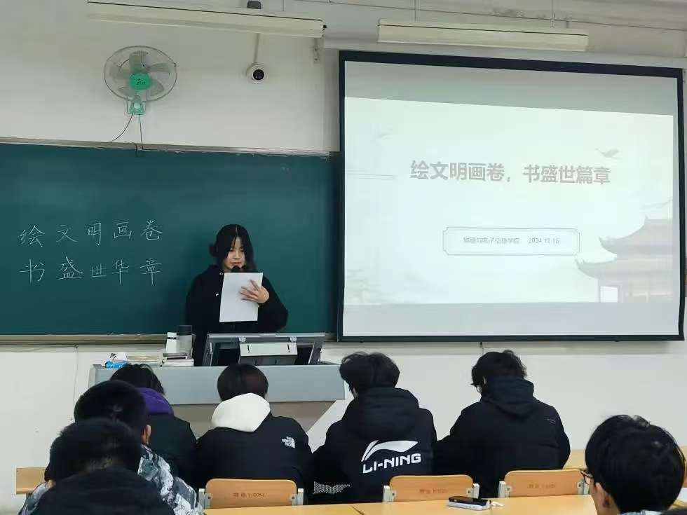 为深化大学生对文明内涵的认知,引导他们在学习、生活和职业发展中自觉践行文明规范,激发创造力和表达能力,12月15日,物电学院在明理楼117教室举办“绘文明画卷,书盛世华章”主题活动。