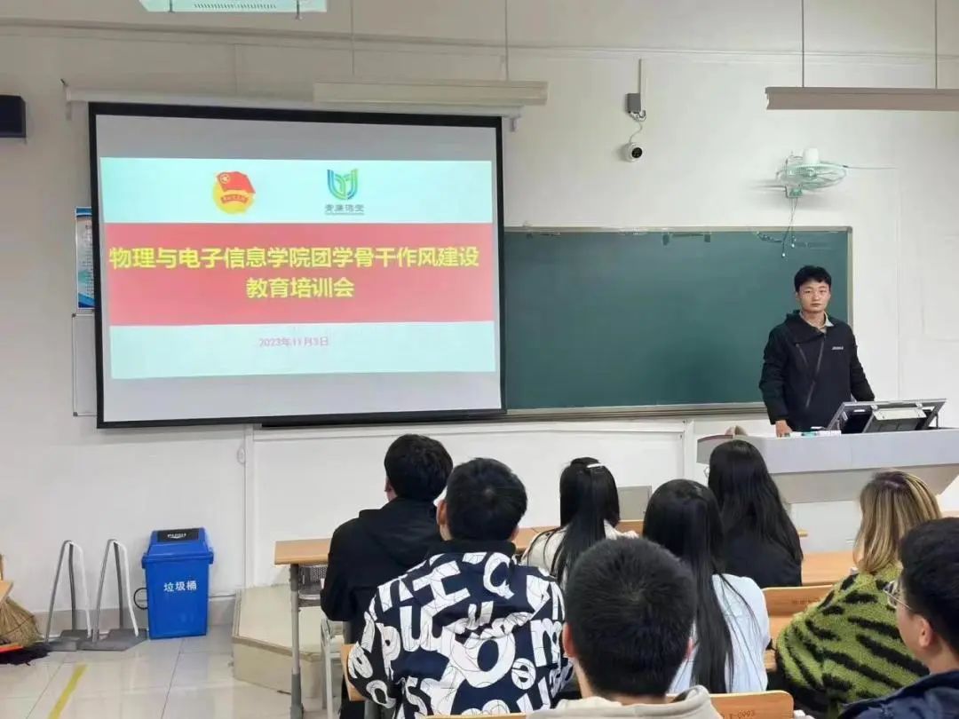 为进一步贯彻落实党的二十大有关新时代廉洁文化建设的各项规定,营造风清气正的廉洁文化教育氛围,按照校团委部署和物电学院团委工作安排,11月3日物电学院召开团学骨干作风建设教育培训会暨“青廉课堂”主题培训,物电学院各年级团学骨干参加了此次培训会。