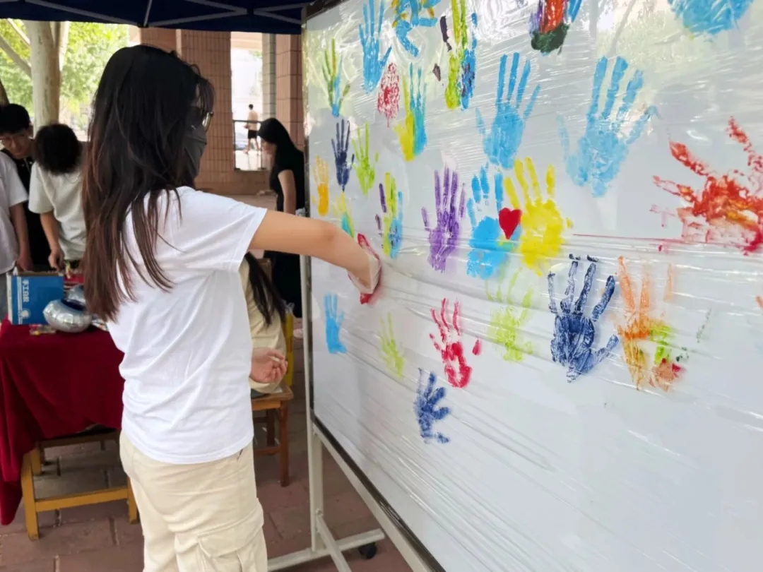 活动以“花草创意秀”拉开帷幕。同学们在校园指定区域展开10分钟“自然拾光”之旅,弯腰捡拾飘落的枫叶、采摘小巧的野花,将自然馈赠装入材料包。随后,大家专注地进行花草搭配组合,并围坐分享创作灵感。活动中的“手指印象汇”充满治愈感。同学们戴上一次性手套,指尖蘸取红、橙、蓝等亮色颜料,在纯白画板上按下指纹或掌印,瞬间化作跳动的色彩符号。白板在众人协作中蜕变为一幅“心灵地图”,让无形的情绪拥有了可触摸的温度,成为集体心理状态的具象化表达。