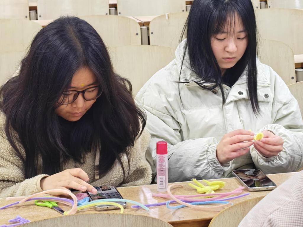 活动开始前,志愿者提前筹备就绪,备好各色扭扭棒及配套工具。现场,志愿者为大家详细讲解并演示了弯折、缠绕、组合等基础技法,还展示了花朵、小动物、发饰等各类精美作品样例,瞬间点燃了同学们的创作热情。活动中,同学们充分发挥想象力与创造力,灵活运用不同颜色的扭扭棒尽情创作,现场氛围轻松愉悦。一根根普通的扭扭棒在指尖逐渐蜕变,灵动的蝴蝶、俏皮的小兔、绽放的玫瑰等栩栩如生的作品接连诞生。整场活动在轻松专注的氛围中有序推进,同学们沉浸式体验手工创作的宁静与乐趣,在完成作品的过程中,不仅锻炼了动手能力与专注力,更在趣味创作中舒缓了期末压力,为冬日校园增添了一抹温暖治愈的色彩。