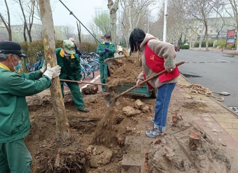 即便是阴雨天气,志愿者们仍展现着不同一般的热情,他们满怀激动的到达植树地点。在环卫工人们的指导下,他们合理分工,团结协作,依次进行着挖坑、填土、栽植、浇水、固定。经过一个多小时,虽然有些疲倦,衣服也溅上了泥渍,但他们仍埋头苦干,乐在其中。每一滴汗水的流下,每一铲泥土的填充,代表着每一个人的奉献与关爱。