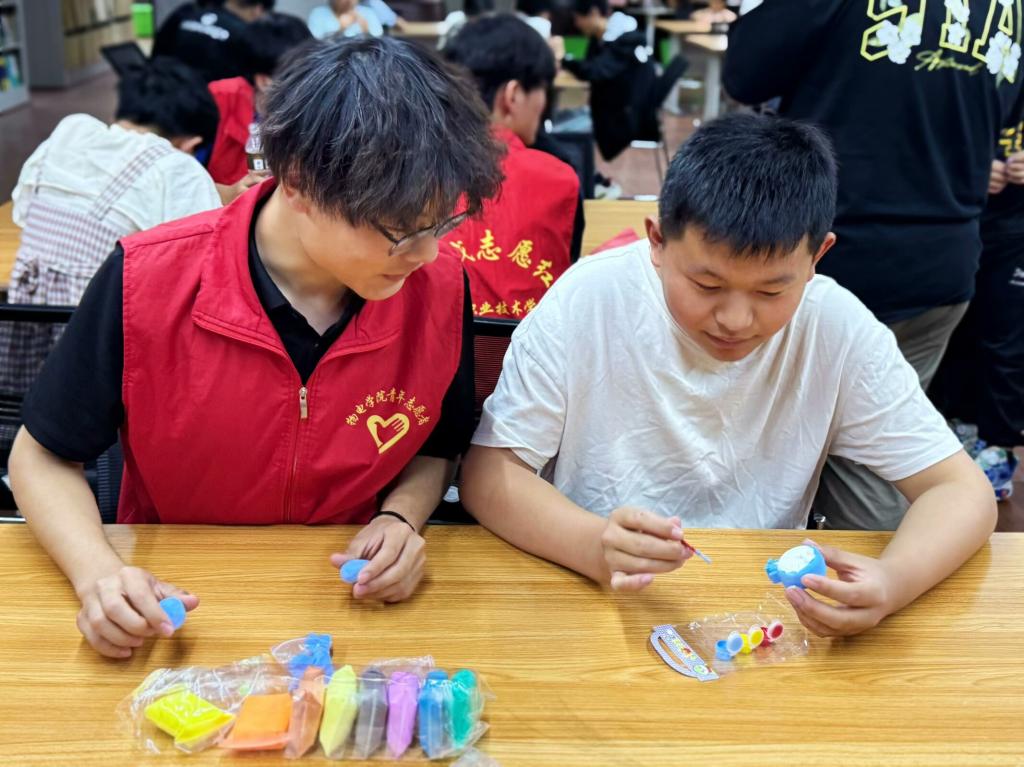 活动中,志愿者们秉持着“奉献、友爱、互助、进步”的志愿服务理念,通过一对一沟通的方式,悉心了解特殊儿童的学习和生活状况,用耐心和爱心打开孩子们的心扉。随后,志愿者带领孩子们参与橡皮泥创意塑形、石膏娃娃彩绘等手工课程,通过寓教于乐的形式,激发孩子们的想象力与创造力,助力他们在实践中获得成长与快乐。最后,志愿者通过分享励志故事,与孩子们深入交流,引导他们树立“自尊、自信、自强、自立”的人生信念,激励他们积极面对生活与学习中的挑战。