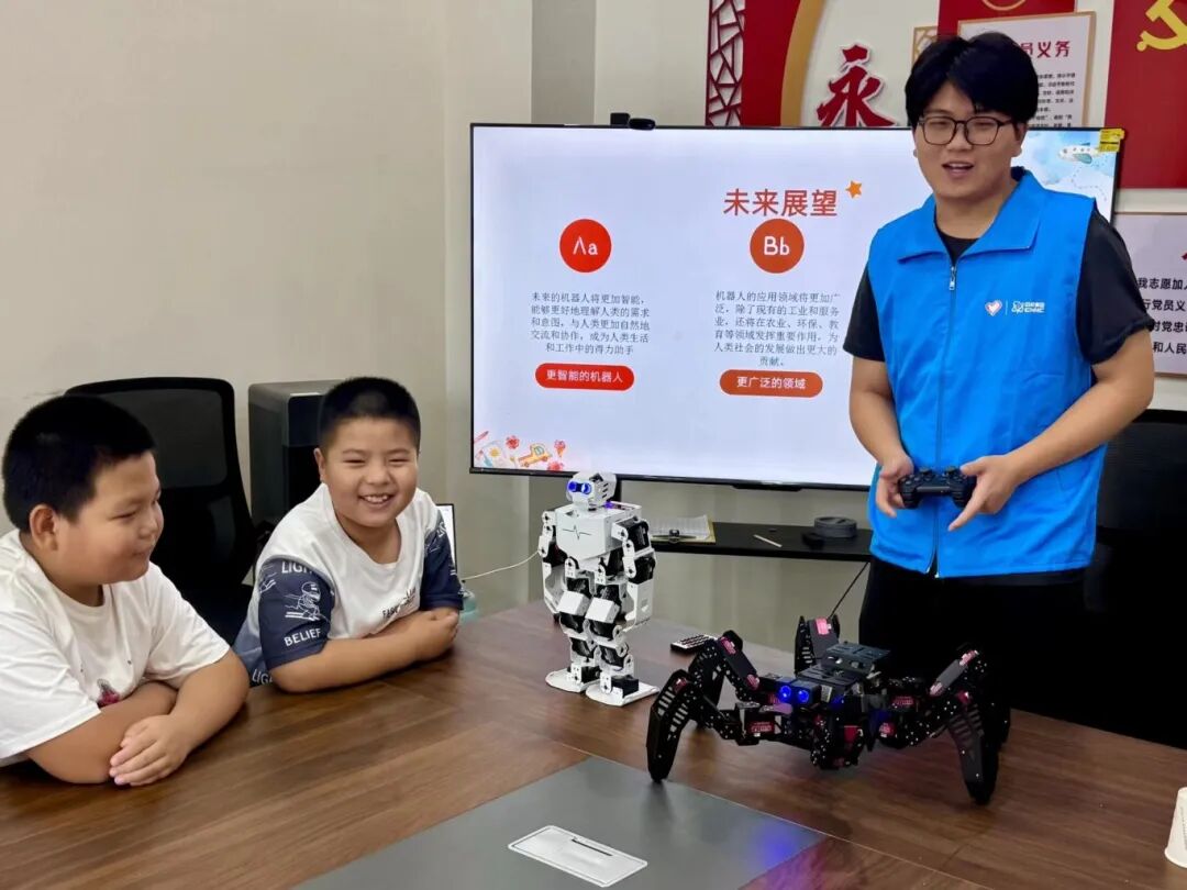 机器人展示环节,成了一场科学与热情的碰撞。我们带来的机器人有着银灰色的外壳,在灯光下泛着金属的光泽。当我操控着机器人做出旋转、前进的动作时,履带与地面摩擦发出轻微的声响,孩子们的欢呼像夏日的蝉鸣般热烈,此起彼伏。有个穿红色短袖的小男孩,激动得从椅子上站了起来,小手使劲地拍着,脸颊因为兴奋而涨得通红。小朋友们纷纷举起手,高高地挥舞着,有的甚至踮起脚尖,生怕我们看不到,都想要体验一把操控机器人的“瘾”。当第一个小朋友握住遥控器,周围的孩子们都屏住了呼吸,目不转睛地盯着机器人,成功的那一刻,活动室里爆发出更响亮的欢呼。可能在此刻,科技的种子真的在不经意间发芽,经过程序而运行的机器人正成为小朋友们成长路上的一位引路人,指引他们走向科学的世界,而我们,正是播撒这颗种子的使者。