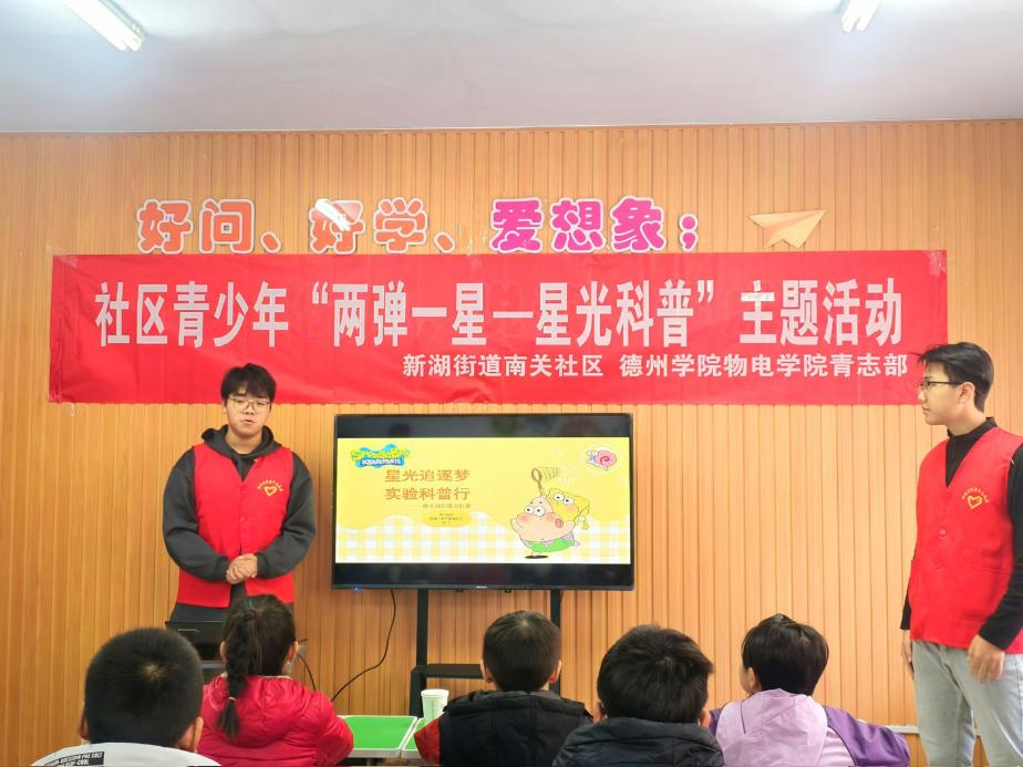 为普及科学文化知识,培养青少年的科学素养与实践能力,弘扬“两弹一星”精神,12月7日,物电学院电子信息工程专业2023级1班团支部“星光”科普志愿服务队在南关社区开展“星光追逐梦·实验科普行”主题科普活动。