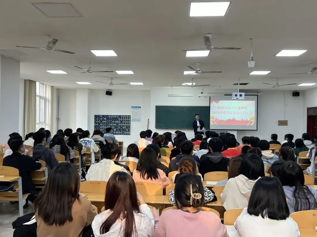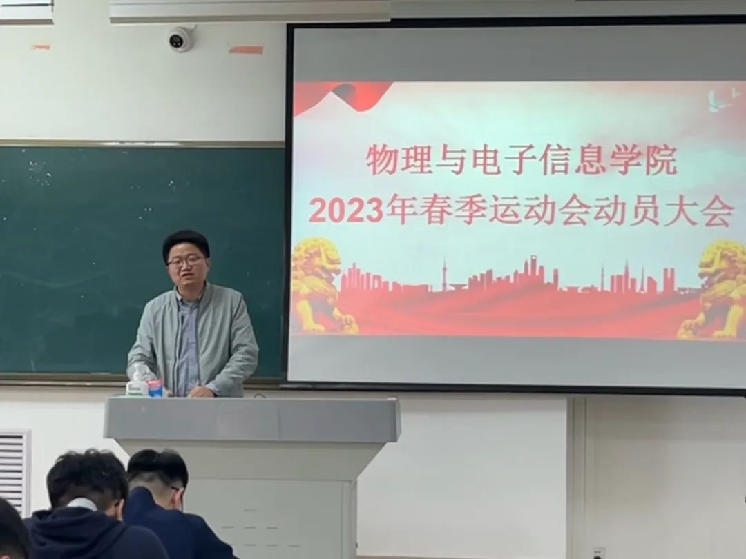 为鼓舞运动员比赛士气,保障校运会期间各项工作有序进行,4月26日,物电学院在明理楼组织召开2023年春季运动会动员大会。大会由物电学院赵振老师主持,各级辅导员老师和全体学生会成员参加。
