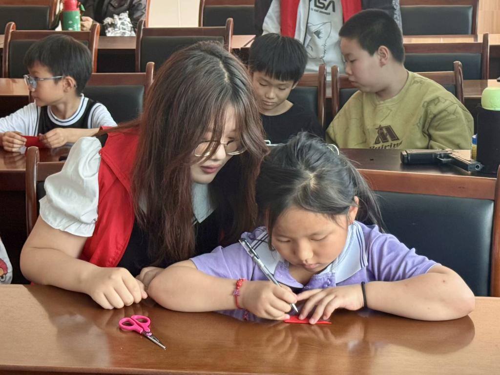 活动伊始,志愿者们以生动有趣的讲解,向小朋友们介绍了五四运动的历史背景、重要意义以及五四精神的内涵。随后,进入了剪纸创作环节,志愿者们拿出提前准备好的工具,耐心地向小朋友们传授剪纸的基本技巧。志愿者们细致入微的讲解,让复杂的剪纸步骤变得简单易懂。在志愿者们的指导下,小朋友们尝试着剪出与五四精神相关的图案——鲜红的五角星、展翅的和平鸽、奋进的青年剪影,成为五四精神与传统文化碰撞出的最美火花。百年前的青年理想与新时代的文化传承完成了跨越时空的对话,“爱国、进步、民主、科学”的精神火种也悄然播撒在小朋友们的心灵深处。