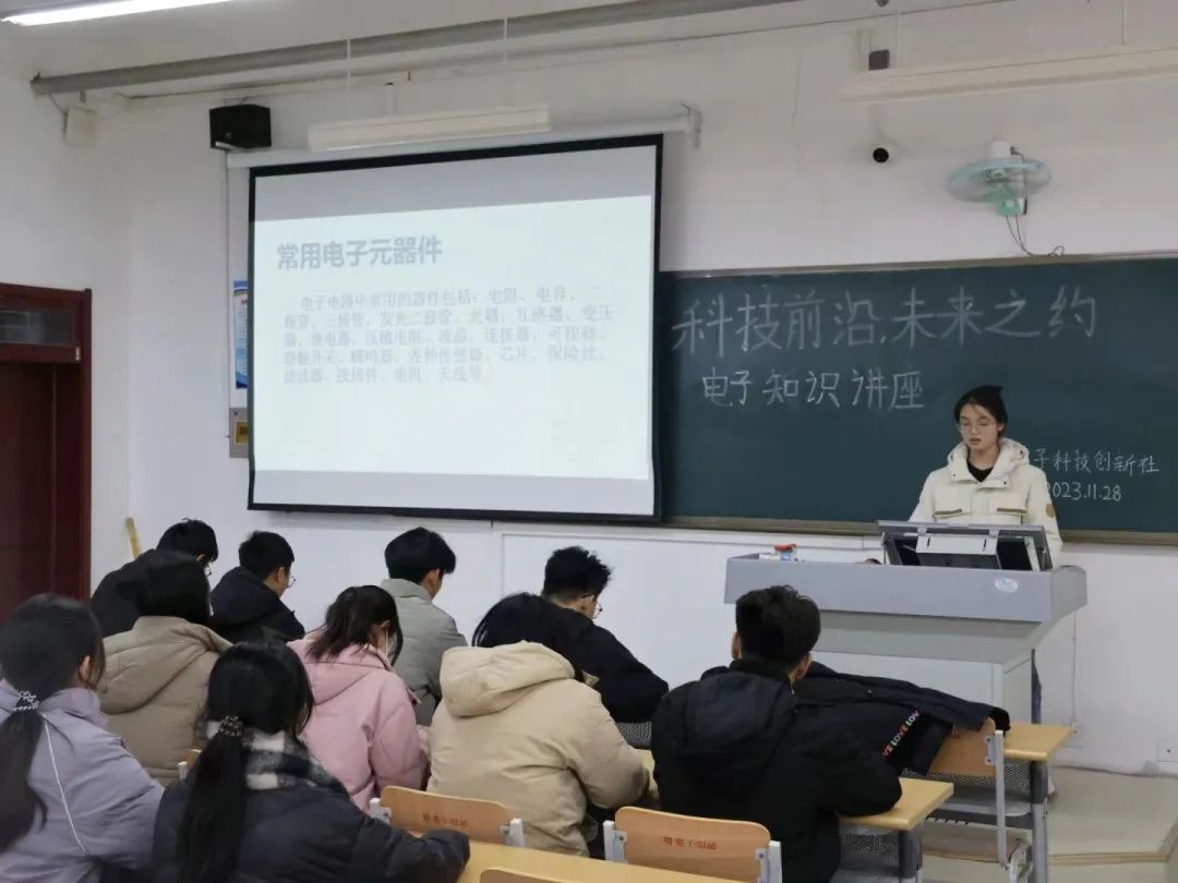 为了帮助同学们了解常用元器件和仪器的原理与功能,进一步培养同学们科技创新精神、提高自身综合素质,提升同学们在电子科技领域的创新能力和实践技能,英国正版365首页电子科技创新社团于11月28日举办了电子元件功能知识讲座。