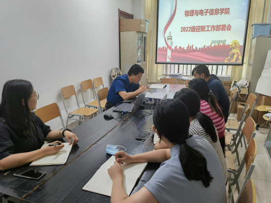 为切实做好2022级新生入学工作,9月16日,物电学院在明理楼219召开2022级迎新工作部署会。物电学院党委副书记申青林主持会议,全体学工人员及2022级新生班主任参加此次会议。