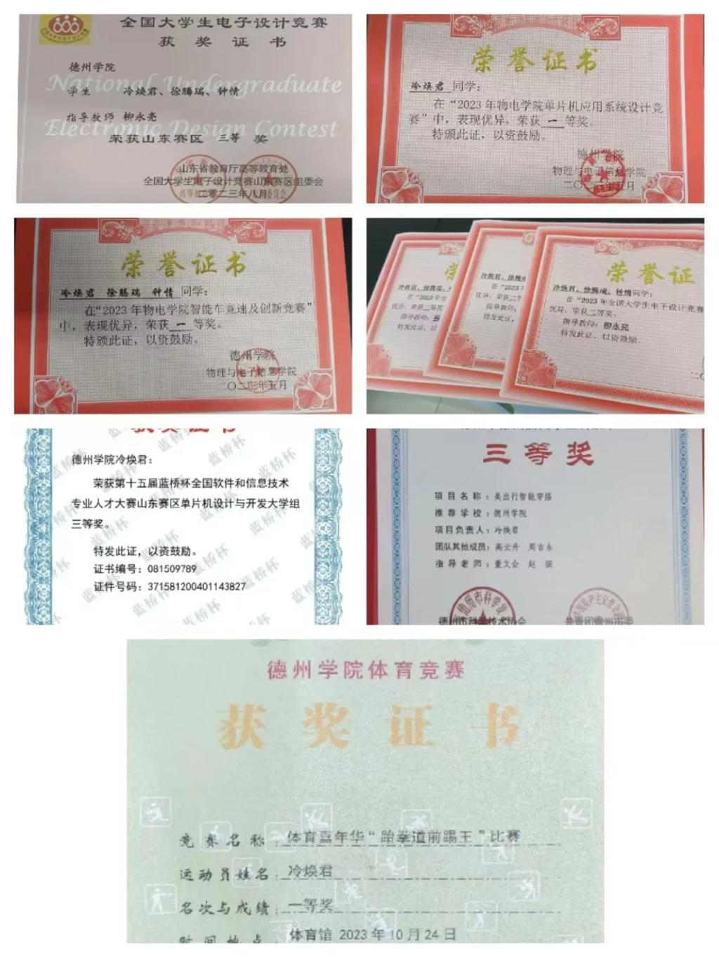 冷焕君在专业知识与实践领域力争做到全面发展,使专业知识和知识技能得到一定的应用和提升。2023 年,她积极投身各类竞赛,于TI杯全国大学生电子设计竞赛(山东赛区)中,凭借其电子设计才能,荣获省级三等奖;在第十五届蓝桥杯全国软件和信息技术专业人才大赛(山东赛区)里,凭借扎实的专业知识,再度斩获省级三等奖。同时,她热爱体育运动,平时加强体育锻炼,在英国正版365首页体育嘉年华“跆拳道前踢王”比赛中,她以出色的表现勇夺校级一等奖。