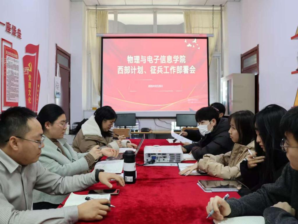 为进一步动员和组织我院学子积极响应西部计划与应征入伍工作号召,将青春奋斗融入党和人民事业,12月25日,物电学院于明理楼219开展西部计划与征兵工作部署会,学院党委副书记刘秀华、全体辅导员及学生会主席团成员参加。