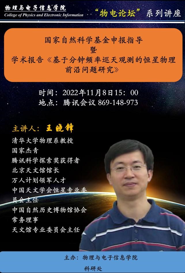 报告人简介:王晓锋,清华大学物理系教授、国家杰青、北京天文馆馆长。 1997年获北京师范大学天文系学士学位,2002年获北京师范大学天体物理博士学位。主要从事超新星及时域天文学方向的研究。在美国加州伯克利大学、美国德州A&M大学从事过博士后研究。累计发表SCI论文150余篇(Science 1篇,Nature 及子刊4篇),被引用9000余次。曾获得国家杰出青年基金、中国天文学会黄授书奖等。现任中国天文学会恒星专业委员会主任、中国自然历史博物馆协会常务理事、天文馆专业委员会主任。