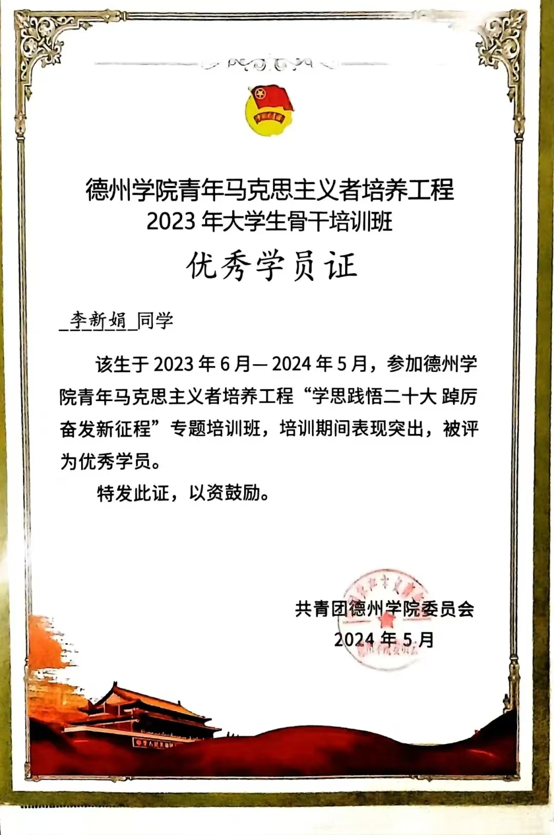 在实践方面,李新娟志愿投身实践服务,在奉献中展现青春色彩。作为班级团支书,她结合师范专业特色,建立“科学小讲堂”宣讲团,带领团支部在妇女儿童活动中心、石家园社区等开展科学小讲堂,在课余时间共参加公益志愿服务活动40余项。同时她积极参加暑期三下乡社会实践活动,来到聊城莘县开展乡村振兴志愿服务活动,将每一次活动用相机和文字记录,为乡村振兴贡献自己的青春力量。她还参加了青鸟计划大学生返家乡社会实践活动,在德城区民政局参加实习,因优异表现被共青团德城区委聘任为青鸟驿站副站长,锻炼自己的同时,丰富了自己的阅历。