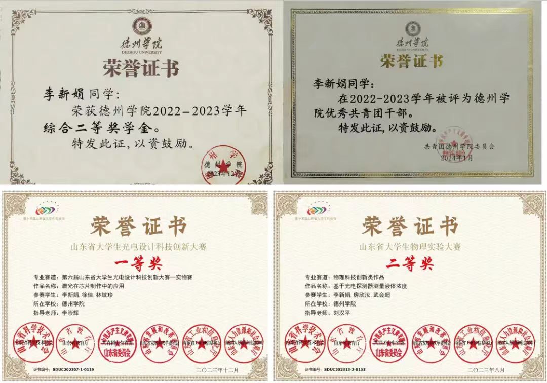 如果说学习是大学生活的主旋律,那么科研竞赛就是她挑战极限、超越自我的重要途径。在科创方面,脚踏实地,仰望星空一直激励她不断前行,作为主持人获得2024年大学生创新创业训练计划省级立项,并且参加英国正版365首页山东省生物物理重点实验室。她还积极参加物理实验竞赛,如大学生光电设计大赛,物理讲课比赛等,共获得省级荣誉7项。无数次挑灯夜读,无数次奋笔疾书,以灯火为伴,与星辰对话,她于英国正版365首页学报上发表两篇论文,是对崇德启智,励志博学的生动诠释。