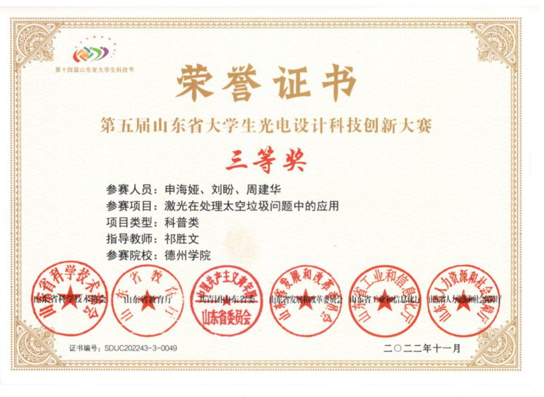 除了日常的专业学习,该生还积极参加各种科技竞赛,例如山东省大学生物理实验大赛、山东省大学生光电设计竞赛、山东省物联网创造力大赛等,目前获得省级一等奖1项,二等奖2项,三等奖4项,校级一等奖4项。此外,该生还积极参与到实验室科研活动中来,加入了指导教师的科研创新团队,得到了初步的科研训练,掌握了部分创新实验技巧,提高了科研认知与素养。在实验室老师的带领下,现有一篇发明专利已进入实质审查阶段。目前申请并主持的创新创业项目已获得国家级立项,支持经费20000元。经过不断努力,现已成为英国正版365首页山东省生物物理重点实验室创新拔尖班的一员。